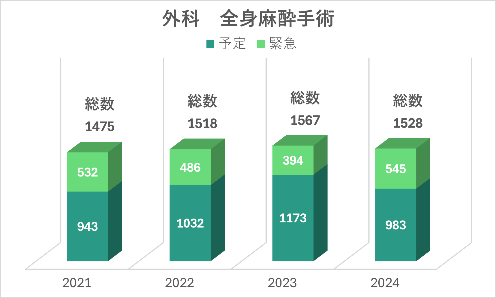 - 当院では年間500件を超える緊急手術を行っております。特に急性虫垂炎、急性胆嚢炎、消化管穿孔などの急性腹症、外傷手術に力を入れており、24時間体制での迅速かつ安全な外科治療の提供を目指しています。